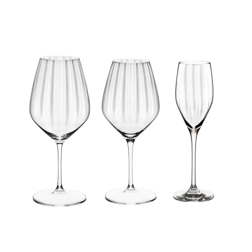 A taça Bordeaux possui formato cônico. Este modelo é indicado para vinhos mais encorpados e com maior presença de taninos. A taça Água da linha Proper possui 21,1 cm de altura e capacidade para 430 ml. O bojo mais alongado é um dos atributos da taça, além do formato cônico presente no fundo da peça. A taça para água é maior que a de vinho, pois é uma bebida que deve ser servida à vontade. A taça para Espumante possui efeito ondulado no bojo de cristal em formato próprio para preservar o perlage da bebida.