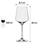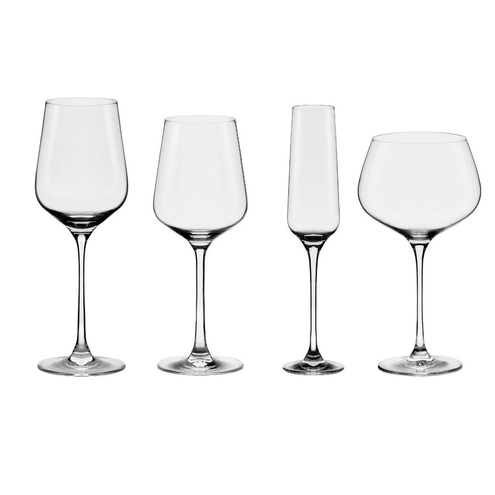 | Conteúdo da embalagem | 6 Taças de Cristal Bordeaux: Altura 26,5 cm, Volume 650 ml | 6 Taças de Cristal Água: Altura 25 cm, Volume 450 ml | 6 Taças de Cristal Espumante: Altura 26 cm, Volume 190 ml | 6 Taças de Cristal Bourgogne: Altura 24 cm, Volume 850 ml |